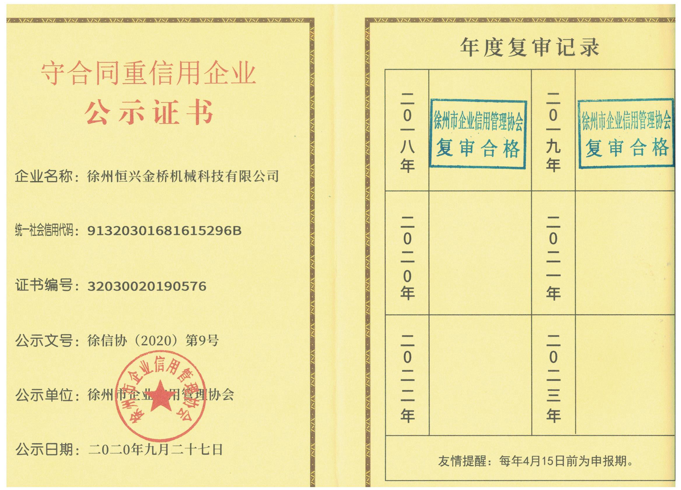 2020年9月,徐州市企業(yè)信用管理協(xié)會(huì)公布了2018—2019年度市級(jí)“守合同重信用”企業(yè)名單,恒興金橋公司榜上有名。