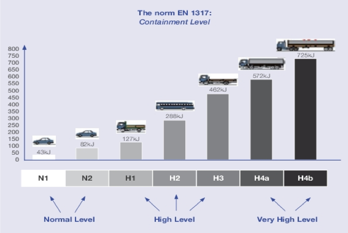 與國外相比,我國高速公路護欄基本防護等級高于日本、法國、英國和北歐等國家,與美國、德國、意大利相當;普通公路護欄,我國護欄的防護等級與美國、日本基本一致。圖1、2分別摘錄歐盟高速公路上設置護欄的最小法定防護等級、EN1317規定的護欄防護能量。從中可以看出,歐盟國家高速高速公路最為發達和行車速度最快的德國、意大利,其防護標準也最高,路側、中央分隔帶護欄對大客車防護指標高,橋梁護欄更是達到大貨車防護的最高指標。同比我國公路護欄設計防護能量最高值已高于美國、歐盟和日本等國外標準。