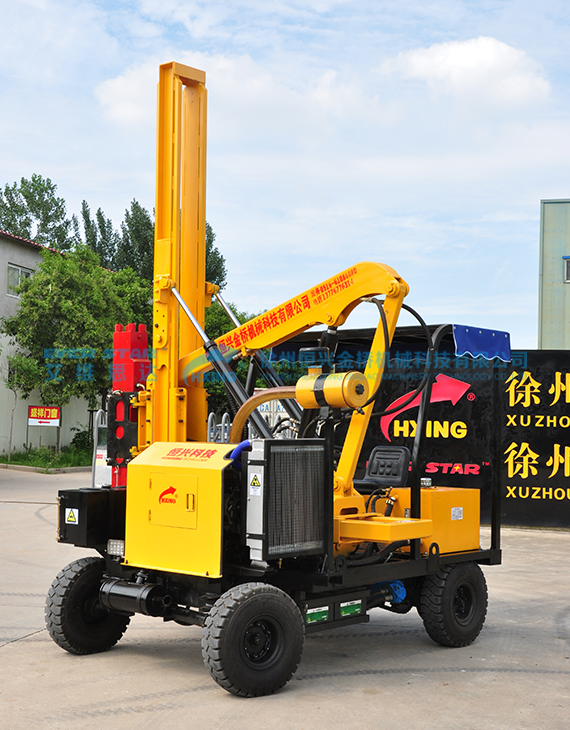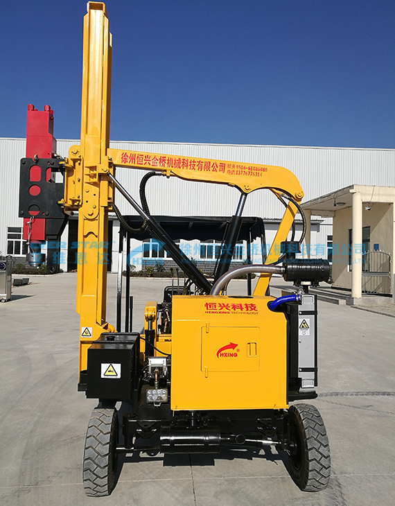 徐州恒興輪式打樁機系列:選配功能:打樁/拔樁/鉆孔 輪式四缸打樁機產品優勢: 1. 加強型升降導軌,鑲嵌尼龍材料,滑動順暢,間隙可調,增加使用壽命 2. 升降臂主體部分整體結構設計不易斷裂,無需二次加固。 3. 85mm釬桿的高頻震動液壓錘,沖擊力高達1400焦 4.釬桿釬帽分體結構經久耐用,不易斷裂 5. 真空助力剎車系統,碟剎轂剎雙重制動,安全系數高(高配置可配斷氣剎) 6. 液壓轉向助力,輕松駕駛 7. 高品質塑料材質柴油箱避免鐵質油箱產生的鐵渣堵塞油路