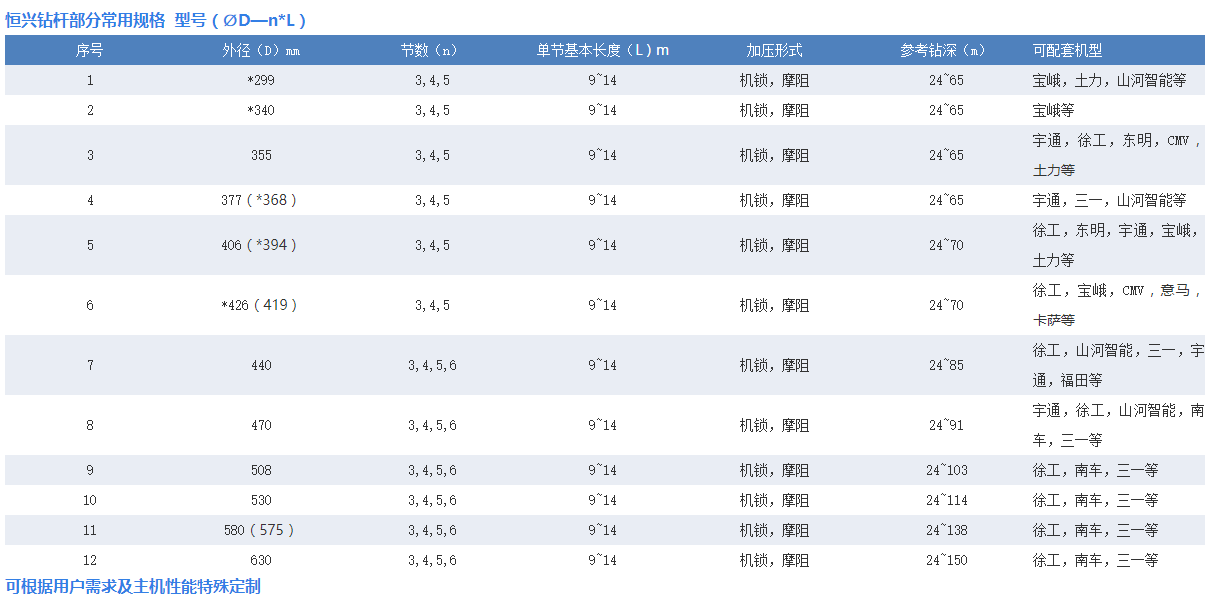 徐州恒興金橋旋挖鉆機鉆桿性能與特點 1.采用國際上先進的鍵式鍵型分布技術(shù),標準模塊化設(shè)計 2.采用先進的加工設(shè)備、加工工藝基工裝制造,為眾多品牌鉆機匹配多套鉆桿 3.整套鉆桿具有重量輕、強度高,單節(jié)鉆桿直線度高,管壁薄、管間間隙小,牙板耐磨性好。滿足了鉆機對鉆桿的特殊要求 4.采用特殊定制的國產(chǎn)合金結(jié)構(gòu)無縫鋼管制造,也可根據(jù)客戶要求選用德國進口高強度無縫鋼管。國產(chǎn)材料中,管材全是采用特殊定制的無縫鋼管,保證了尺寸精度、位置誤差、力學(xué)性能以及良好的焊接型,小直徑管采用合金液壓支柱管,并進行了特殊的二次熱處理,強度可達800Mpa以上 5.合金鋼制作的外牙,全部經(jīng)過特殊熱處理后,同時具有高硬度高韌性和良好的焊接性能,大大提高了牙板耐磨性,從而降低了鉆桿使用的故障率和保養(yǎng)費用 6.鉆桿有摩阻式、機鎖式和組合形式,長度根據(jù)用戶實際需求并結(jié)合鉆機參數(shù)確定。不同的扭矩可以與大小、噸位不同的旋挖鉆機匹配,外徑系列和扭矩系列可以任意組合,吊耳和方頭有多重鏈接方式可共客戶選擇 7.材料規(guī)格齊全,可為國內(nèi)保有的任何一型號國產(chǎn)或進口鉆機配套鉆桿,鉆桿均為全扭力使用,鉆深可達100米以上 8.長期維修多種鉆桿,具有豐富的鉆桿現(xiàn)場維修服務(wù)經(jīng)驗,現(xiàn)場維修速度快